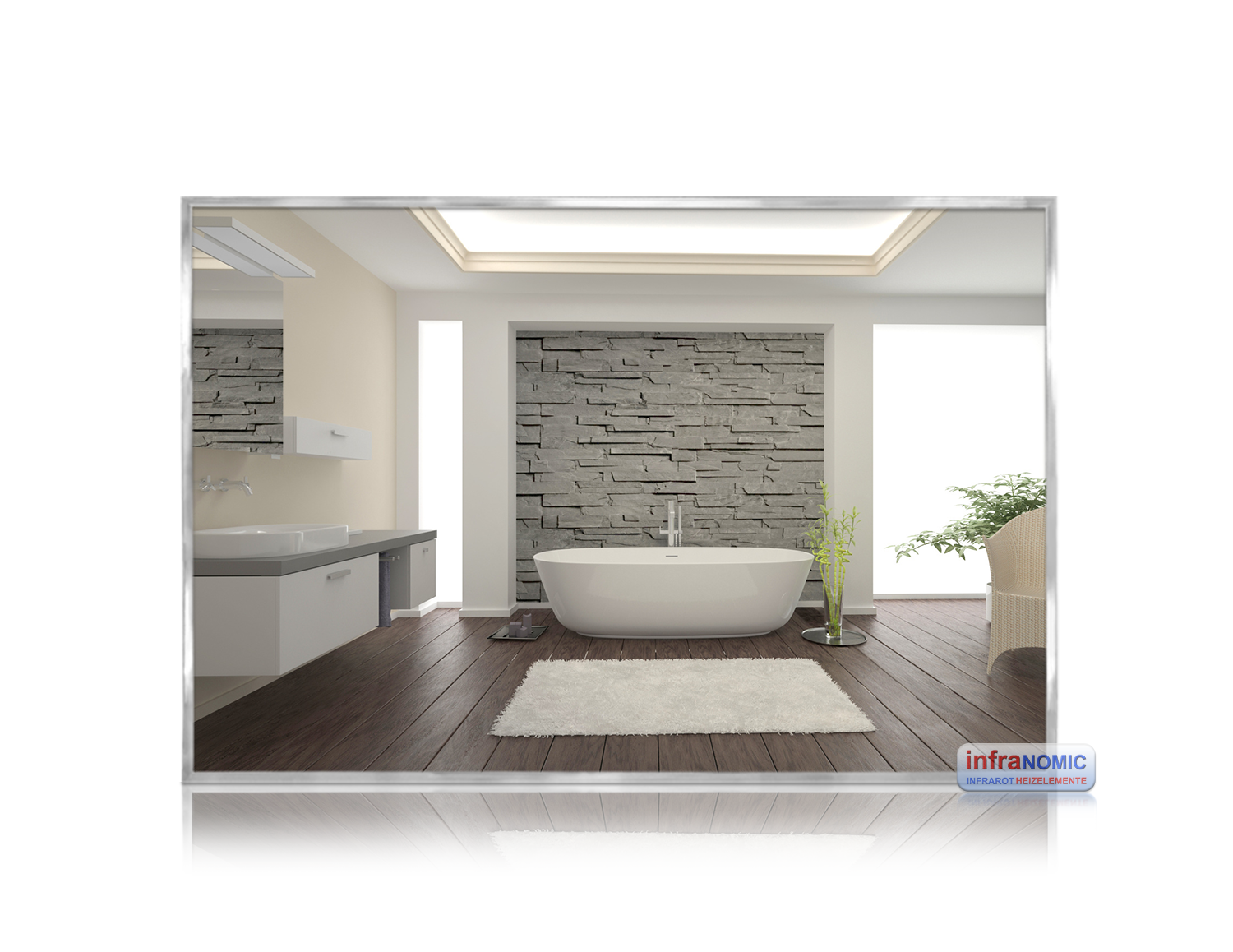 Frameline IR spegelvärmare – infraröd värmepanel med säkerhetsglas och aluminiumram, för badrum
